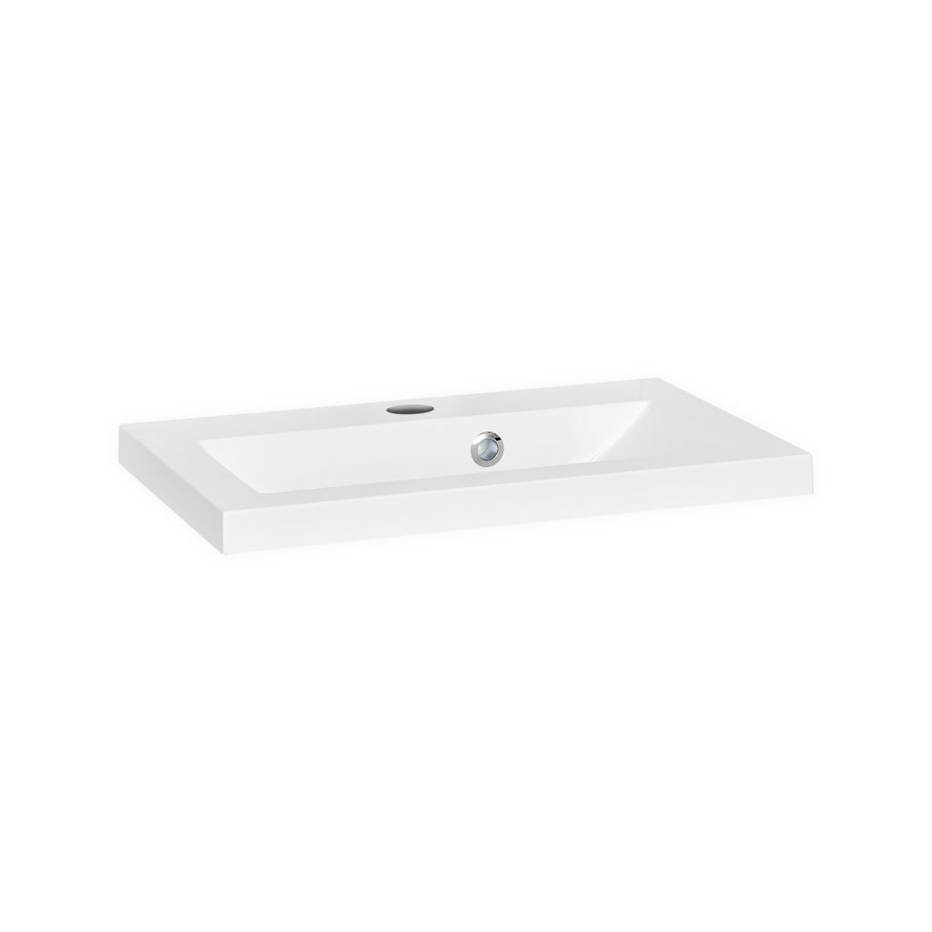 Tvättställsskåpet inkluderar lådor och ett handfat i gjutmarmor med vattenlås.